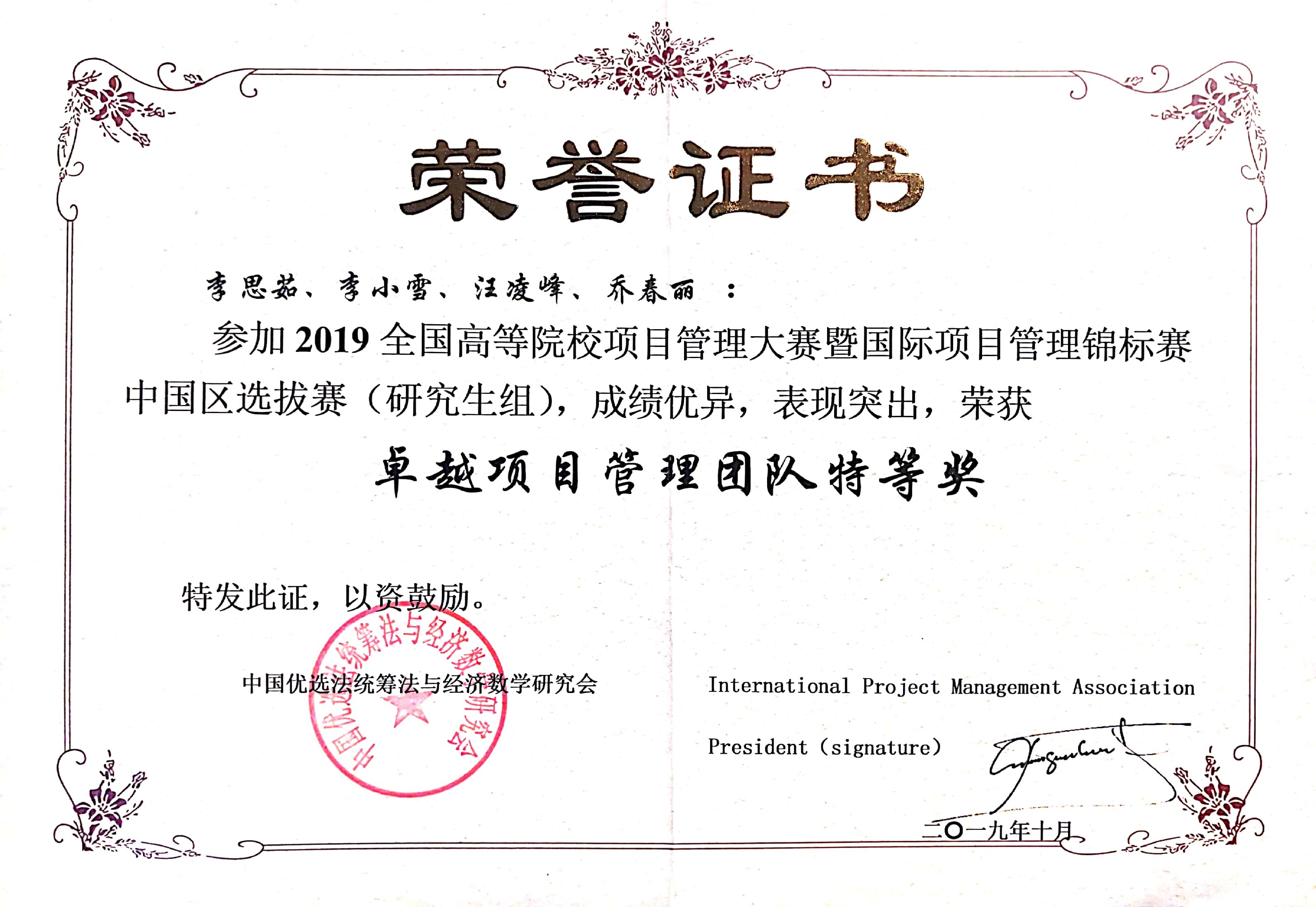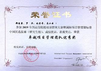 我校工程管理研究生在2019(第四届)全国高等院校项目管理大赛勇夺佳绩2019-11-1510月26日-27日,2019(第四届)全国高等院校项目管理大赛暨国际项目管理锦标赛中国赛区选拔赛在青岛科技大学成功。本届大赛由中国优选法统筹法与经济数学研究会项目管理研究委员会(PMRC)和国际项目管理协会(IPMA)主办,青岛科技大学经济与管理学院、北方工业大学、中国青年项目管理者俱乐部(CYC)联合承办。 -
